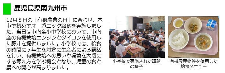 オーガニックビレッジなど全国の自治体に対し、12月8日(「有機農業の日」)の前後で、学校給食での有機農産物等の提供の実施について呼びかけを行いました。このページでは、キャンペーン内容に賛同し、実際に取り組んでいただいた内容をご紹介しています。