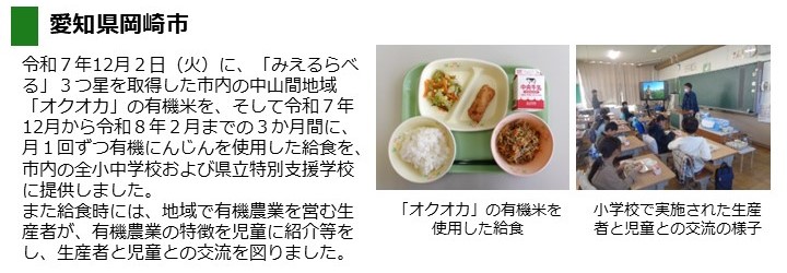 - 令和7年12月2日(火曜日)に、「みえるらべる」3つ星を取得した市内の中山間地域「オクオカ」の有機栽培米を、市内の全小中学校および愛知県立特別支援学校に提供しました。また、令和7年12月から令和8年2月まで、月1回ずつ有機にんじんを使用した給食を提供しました。
