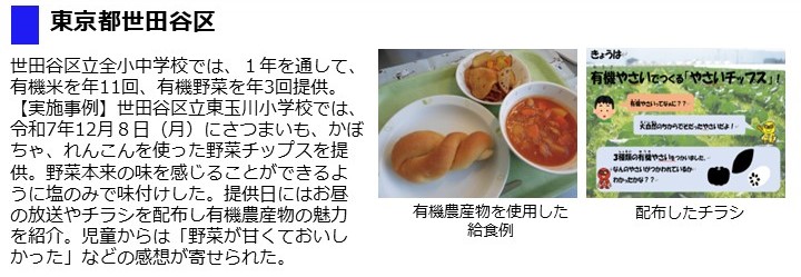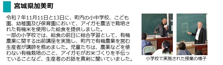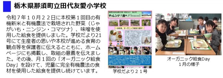 - 栃木県那須町立田代友愛小学校では、令和7年10月22日(水曜日)に初めて、有機新米と有機農業で栽培された野菜(じゃがいも、にんじん、小松菜)、味噌を使用した給食を提供し、学校だよりやHPにおいて生産者の思いや食育観点等を紹介しました。当日の様子はこちら