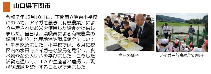 - 令和7年12月10日(水曜日)に、下関市立豊東小学校において、アイガモ農法による有機栽培米を使用した給食を提供しました。当日は、県職員による有機農業の説明を実施しました。