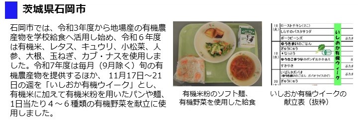 - 石岡市では通年で地場産の有機農産物を活用しており、令和7年度は9月を除く毎月、旬の有機農産物を提供しました。
