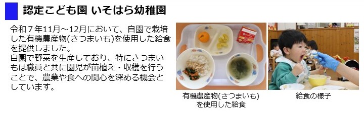 - 令和7年11月~12月において、認定こども園いそはら幼稚園で有機農産物等(さつまいも)を使用した給食を提供しました。