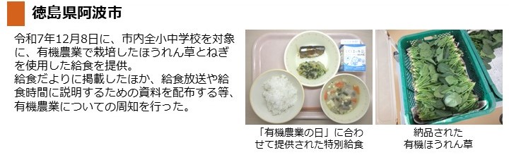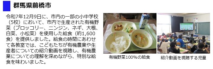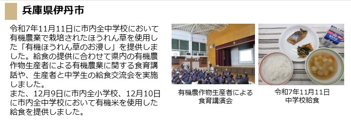 - 令和7年11月11日に、市内全中学校において、有機農業で栽培されたほうれん草を使用した給食を提供しました。また、12月9日に市内全小学校、10日に市内全中学校において、有機米を使用した給食を提供しました。