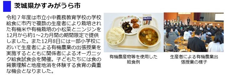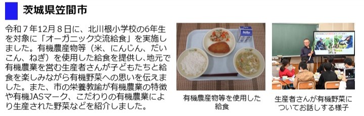 - また、12月8日「有機農業の日」に合わせ、生産者による有機農業に関する出張授業、かすみがうら市オーガニック推進協議会の構成員と関係者によるオーガニック給食試食会を実施しました。