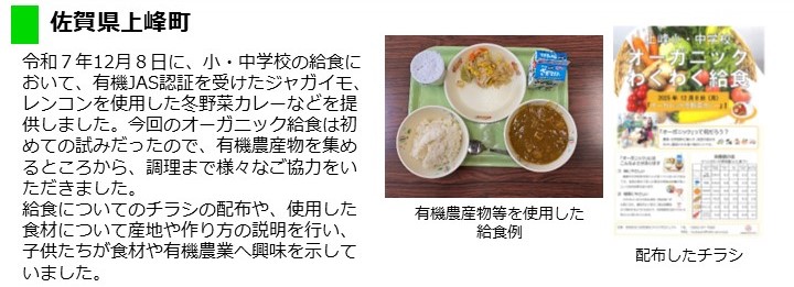 - 令和7年12月8日(月曜日)に、町内の小中学校で有機農産物(じゃがいも、れんこん)を使用した給食を提供しました。