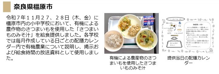 - 令和7年11月27日(木曜日)、28日(金曜日)に、橿原市内の小中学校において、有機農業で栽培されたさつまいもを使用した給食を提供しました。