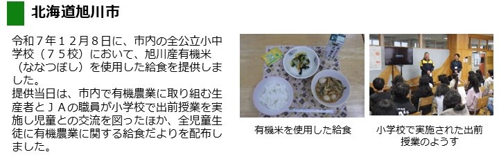 - 令和7年12月8日(月曜日)に、市内の全公立小中学校において、旭川産有機米を使用した給食を提供しました。