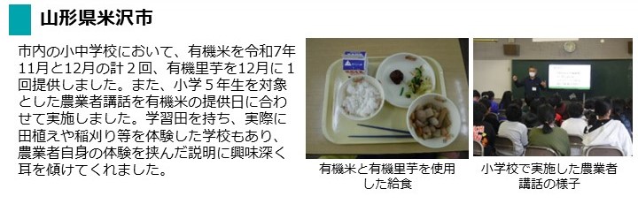 - 令和7年11月~12月に、市内の小中学校において有機農産物(米、里芋)を使用した給食を提供しました。