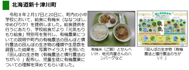 - 令和8年2月17日(火曜日)および20日(金曜日)に、町内の小中学校において、有機米(ななつぼし、ゆめぴりか)を使用した給食を提供しました。