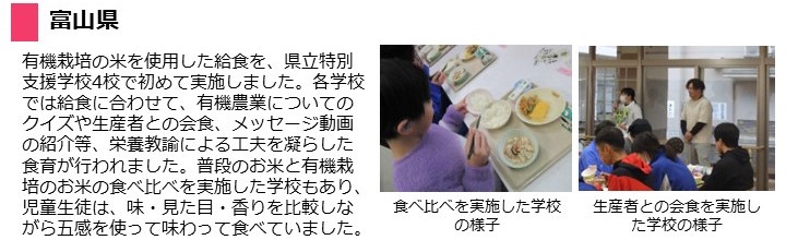 - 各学校では、給食の取組に合わせて、有機農業についてのクイズや生産者との給食交流会、メッセージ動画の紹介等、栄養教諭による工夫を凝らした食育が行われました。