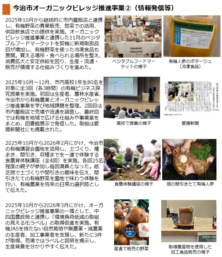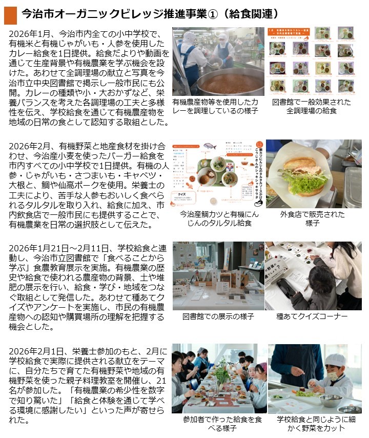 - 令和8年1月および2月に、市内全ての小中学校において、有機米や有機野菜を使用したカレー給食や、今治産小麦や有機野菜を使用したバーガー給食を提供しました。