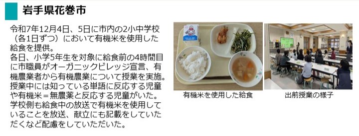 - 令和7年12月4日(木曜日)及び12月5日(金曜日)に、市内一部小中学校で有機農産物(米)を使用した給食を提供しました。