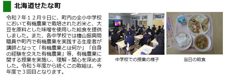 - 令和7年12月9日(火曜日)に、町内の全小中学校において、有機農産物等(米、味噌)を使用した給食を提供しました。