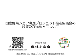 農林水産省では、海外調達の不安定化によるリスク軽減のため、加工・業務用を中心とした国産野菜の生産、供給に関わる事業者の経営安定化等を通じ、国産野菜の活用拡大を図る「国産野菜シェア奪還プロジェクト」を立ち上げることとしました。