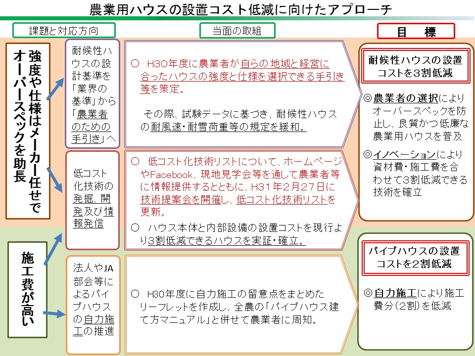 農林水産省では、農業用温室の設置コスト低減に向けて、農業者の選択に資するよう、低コスト化技術を収集・検討していくこととしています。