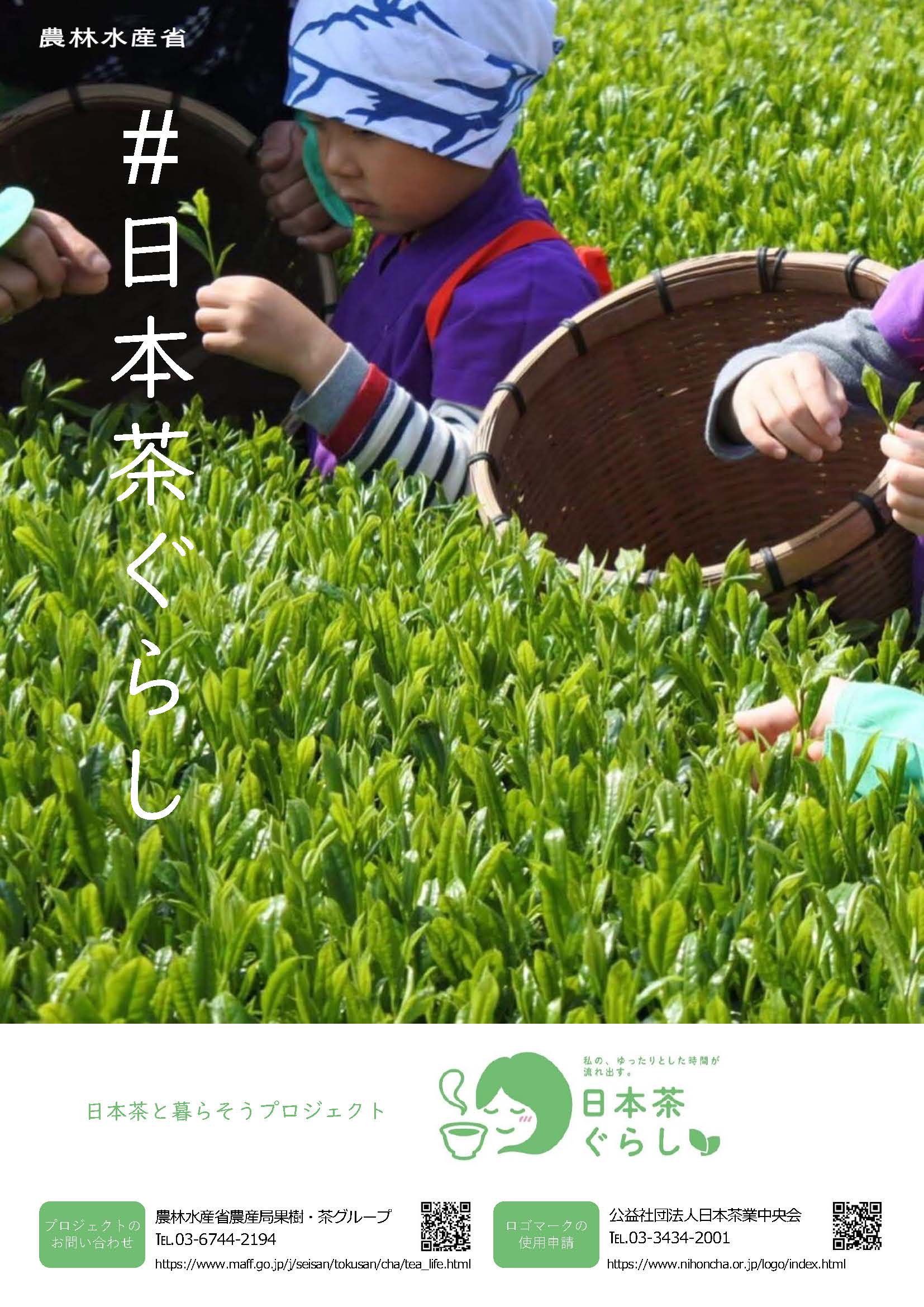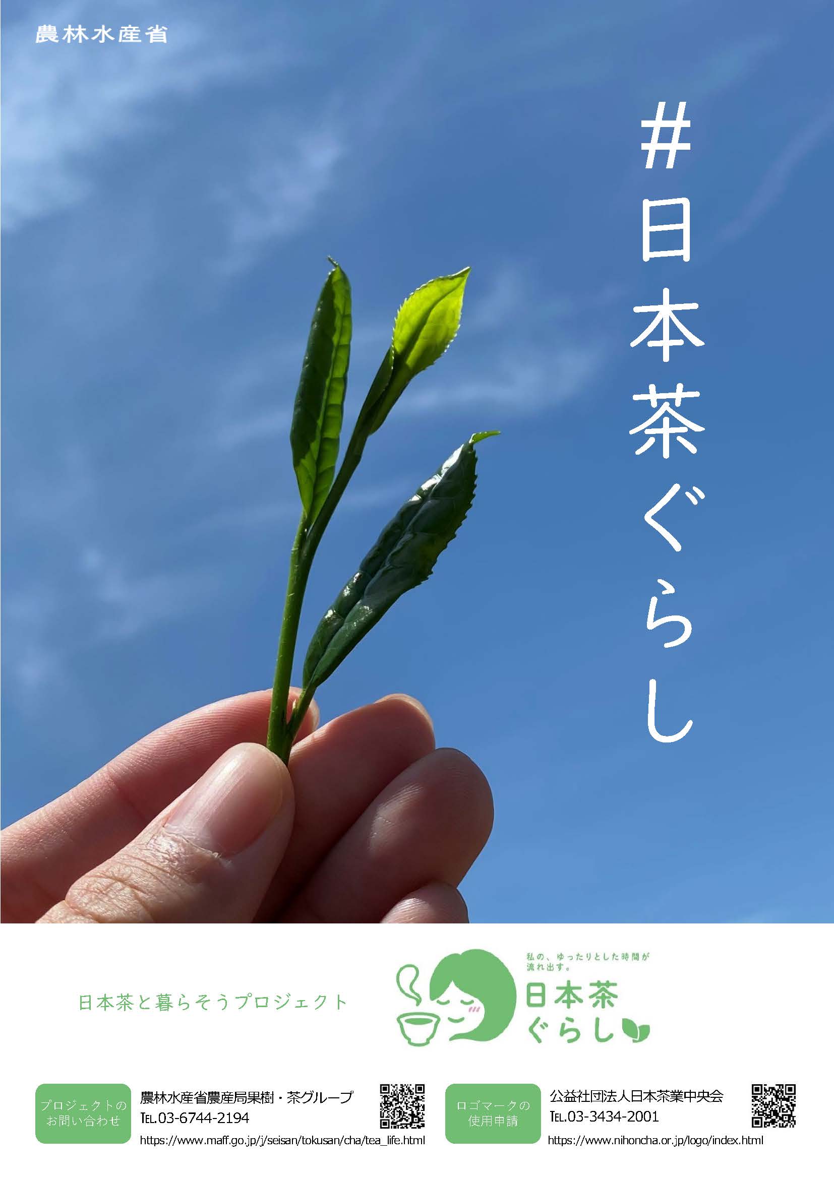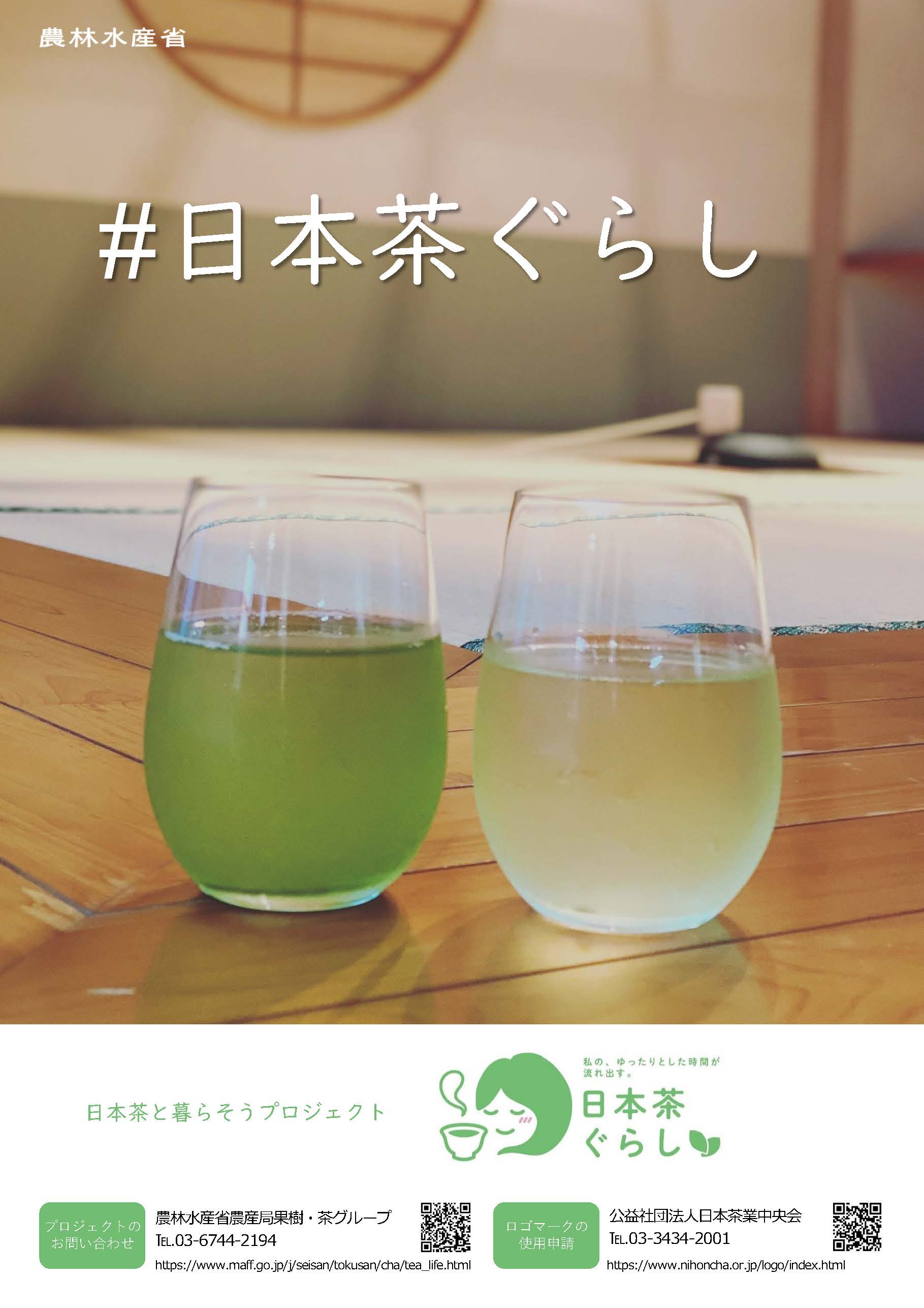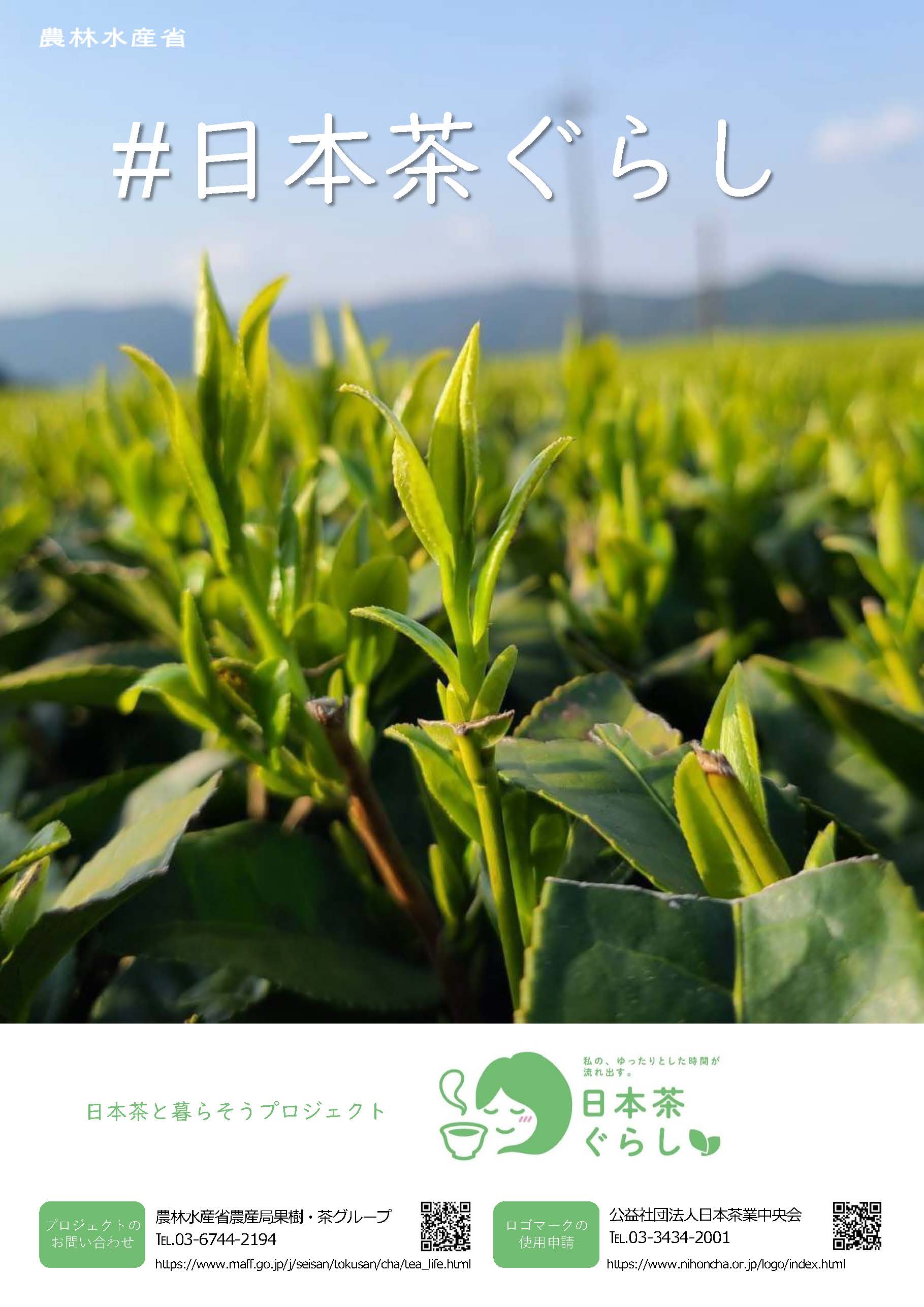 - 日本茶業体制強化推進協議会が「日本茶ぐらし」のポスター(PDF : 819KB)とリーフレットを作成しました。全国の茶業関係者と連携してPRしていきます。