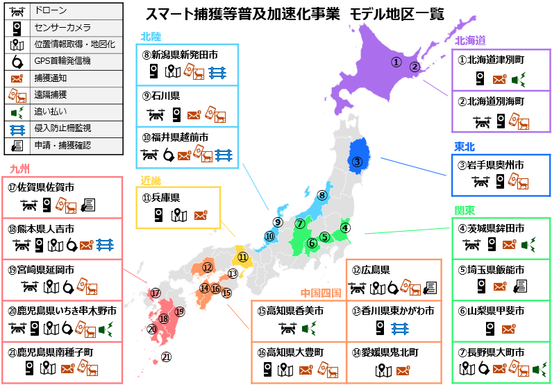 本事業により、ICT機器等を活用した鳥獣被害対策の実証および他地域への横展開を実施するモデル地区の取組概要を掲載します。
