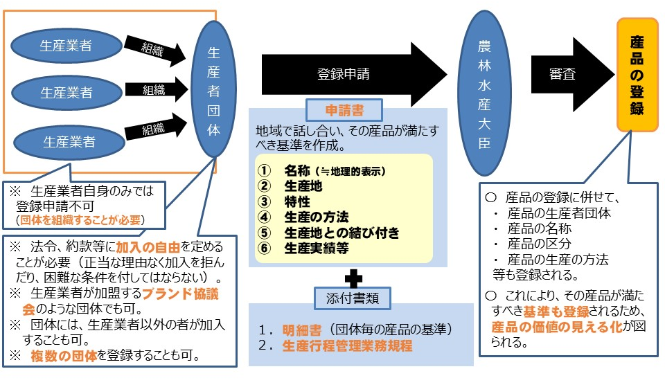 | 地域の生産業者の組織する団体(生産者団体)が、その生産する産品に係る「地理的表示」について、申請書類と添付書類(明細書、生産行程管理業務規程等)を作成し、農林水産大臣に登録申請を行います。 |