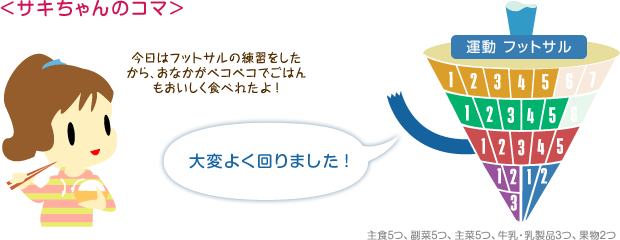 主食、副菜、主菜のように一日の適量の「つ」に幅があるものは、その範囲に入ればOK。サキちゃんは、主食は5~7つ、副菜は5~6つですので、コマが全部うまっていなくても、「ちょうどよい」範囲(はんい)になっていますから、コマが「大変よく回った」となります。