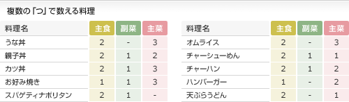 例えば、一般的なカレーライスの場合、ごはん約200g(主食2つ分)・肉約60g(主菜2つ分)・野菜140~150g(副菜2つ分)程度のものが多く、この場合は、1皿で3つの料理グループが含まれているとし、主食「2つ」、副菜「2つ」、主菜「2つ」として数えます。