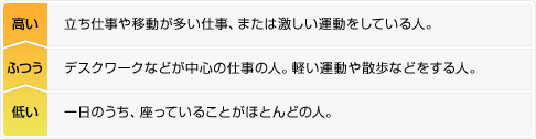 身体活動レベルは、日常生活や運動などの活動量に応じて3つの段階に分けたものです。