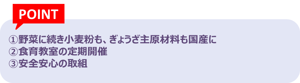 | 日本の野菜をおいしく食べる! 野菜、麺、ぎょうざの主材料は すべて100%国産です。 ![]() |