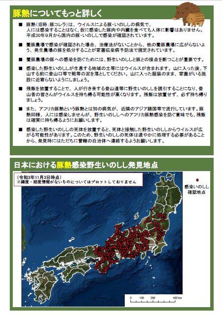- いのししの死体を見つけたら管轄の自治体に連絡して下さい。