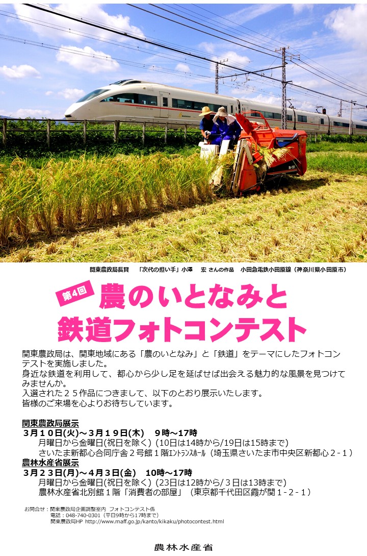 農林水産省関東農政局では、毎年、関東地域にある「農のいとなみ」と「鉄道」をテーマにしたフォトコンテストを実施しております。今回、第4回フォトコンテストにおいて入選されました25作品を展示いたしますので、あなたにとっての「身近な鉄道を利用して、都心から少し足を延ばせば出会える魅力的な風景」を是非とも見つけて下さい。