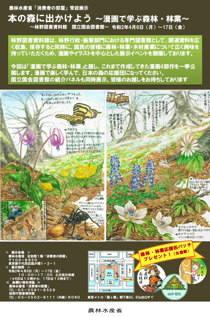 林野図書資料館は、林野行政・施策部門における専門図書館として、関連資料を広く収集、保存すると同時に、国民の皆様に森林・林業・木材産業について広く興味を持っていただくため、漫画やイラストを中心とした展示イベントを開催しております。今回は「漫画で学ぶ森林・林業」と題し、これまで作成してきた漫画4部作を一挙公開します。漫画で楽しく学んで日本の森の応援団になってください。