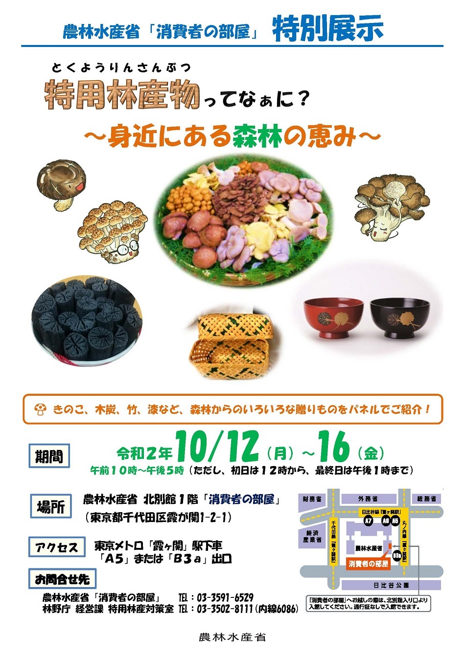 10月15日は「きのこの日」です。展示では、きのこ類をはじめ、木炭、竹、漆等の特用林産物について、パネル、パンフレット等によりわかりやすく解説します。併せて、実物のきのこや木炭、竹製品、漆製品等を展示・紹介し、特用林産物に関する理解の促進と普及による需要拡大を目指します。是非、お越しください!