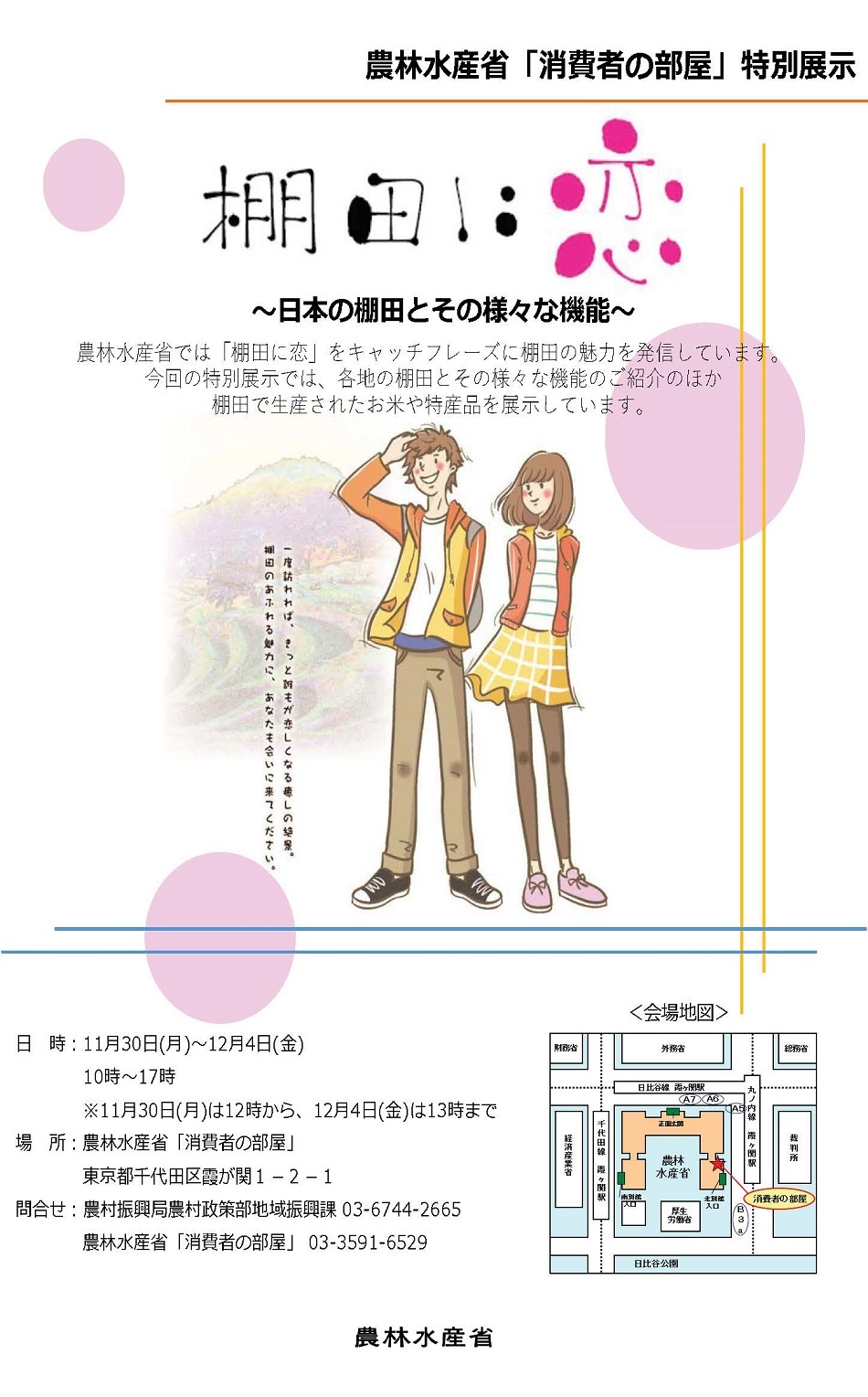 (ア)棚田カードの取組に関するパネル展示、(イ)農業・農村の多面的機能のパネルやパンフレット展示、(ウ)棚田や多面的機能のPR動画の放映を行います。棚田カードの取組をパネル展示することで、棚田地域をPRします。また、農業・農村の多面的機能について、パネルやパンフレットを用いて多くの方に紹介することで、多面的機能等の理解増進を図ります。是非、お越しください!
