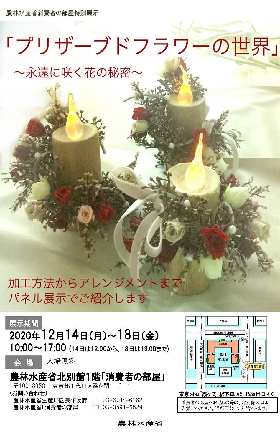「プリザーブドフラワー」とは、ドライフラワーや造花とはまったく異なる加工花です。生花のうちに色素を抜き、特殊な染料を吸わせることで、色鮮やかな美しさとソフトな風合いを長期間にわたって保ちますので、水やりの必要もなく長くお楽しみいただけます。今回はそんな夢のようなブリザーブドフラワーを紹介させていただきます。「プリザーブドフラワー」の素晴らしさを消費者にアピールし、理解を深めてもらうことにより、国産花きの消費拡大を図ります。是非、お越しください!