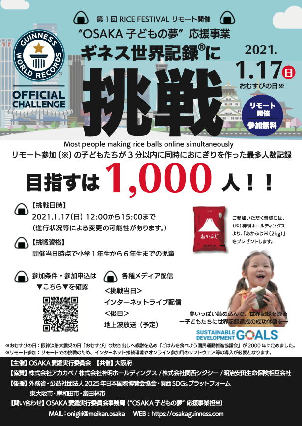大阪府及び府内市町村が参画している公民連携の取組みの一つであるOSAKA愛鑑実行委員会は、OSAKA子どもの夢応援事業の一環として、令和3年1月17日に小学生1000人がリモートで同時におにぎりを作るギネス世界記録に挑戦します。