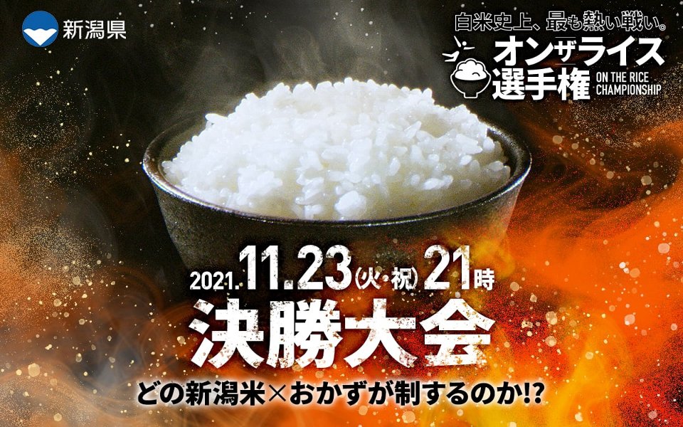 新潟が誇るお米たちが、厳選された絶品おかずを受け止める「飯テロ」映像エンターテインメント!その決勝大会(2021年11月23日(火・祝)21時よりYouTube Live及びTwitterでライブ配信)審査員として、BUZZ MAFF YouTuberの大島さんと白石さん、元体操金メダリスト森末慎二さんなどが出演します。白米史上、最も熱い戦いを是非ご覧下さい。
