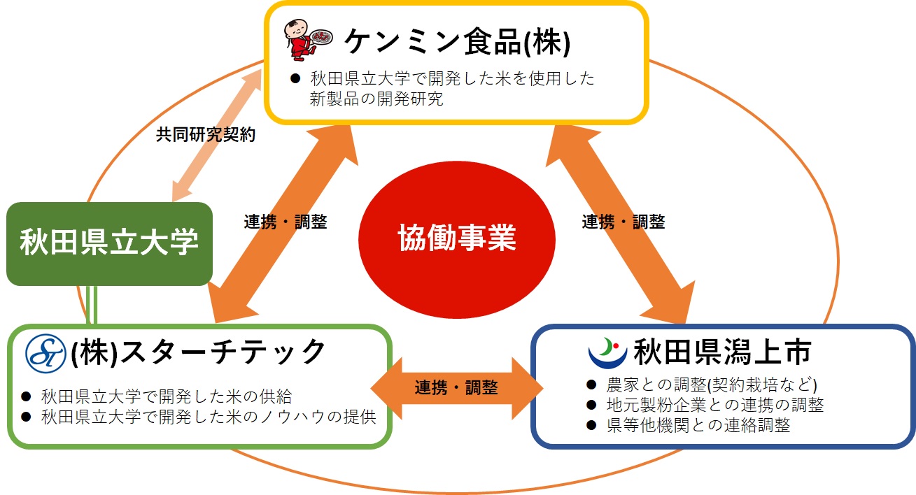 秋田県立大学で開発された米を活用し、高付加価値商品の開発を行うため、ビーフンメーカーのケンミン食品株式会社、秋田県潟上市、秋田県立大学のベンチャー企業の株式会社スターチテックが包括連携協定を結び、令和2年11月20日に3者連携協定締結式を行いました。