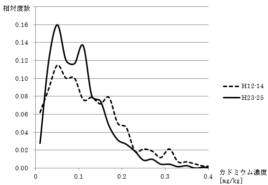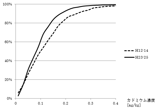 コメ中のカドミウム濃度の分布は、図1が示すように、前回調査に比べて今回調査では低濃度方向に移動したため、高濃度における頻度が低下しました。
