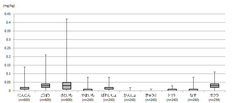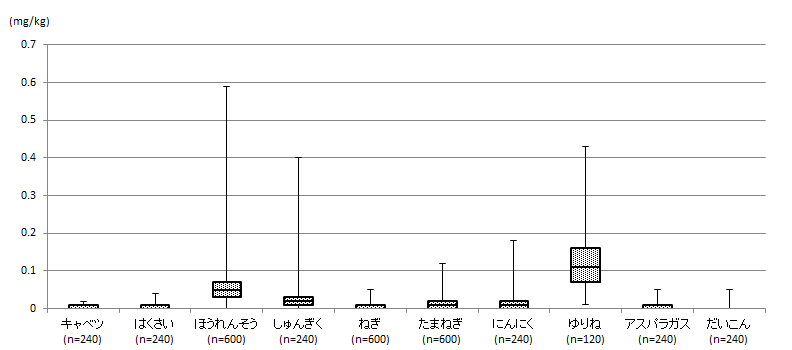 特に、キャベツ、はくさい、ねぎ、だいこん、やまいも、かんしょ、きゅうり、トマト、なす、アスパラガスでは、分析試料の50%以上が定量限界(0.01 mg/kg)未満であり、平均値も0.01 mg/kgと低い値でした。