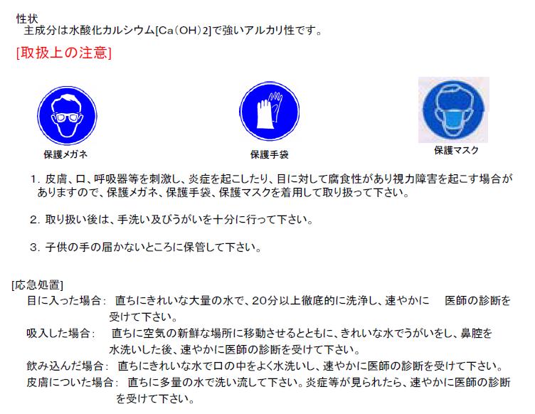 主成分は水酸化カルシウム[Ca(OH)2]で強いアルカリ性です。
