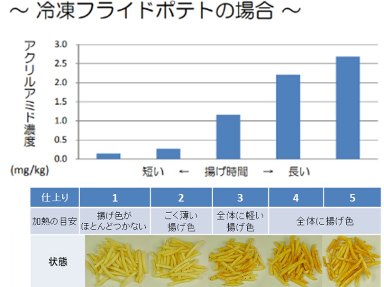 なお、食べるときに揚げ調理が必要な冷凍フライドポテトを調理した場合の揚げ色とアクリルアミド濃度の関係は以下のとおりとなります。