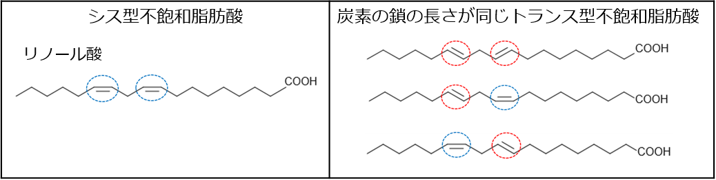 • 植物油に天然に多く含まれるリノール酸は、シス型の脂肪酸に分類されます。このリノール酸と炭素の数及び二重結合の数が同じトランス脂肪酸は、理論上3種類あります。トランス脂肪酸は、炭素の鎖が長く二重結合の数が多いほど、理論上多くの種類があることになりますが、必ずしもそのすべてができるわけではありません。