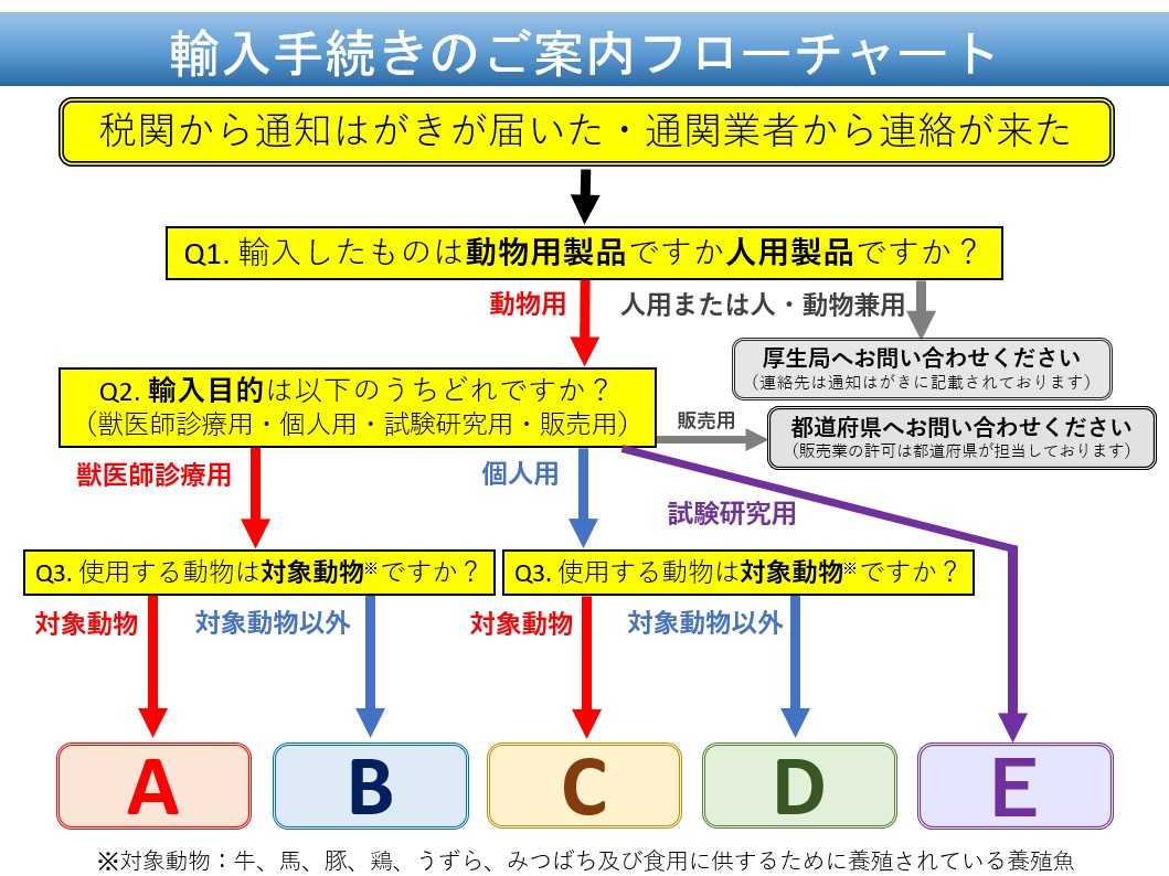 輸入する製品が動物用医薬品等かどうか分からない場合はこちら - Eの場合:動物用医薬品等を輸入するためには手続きが必要となります。手続きはこちら