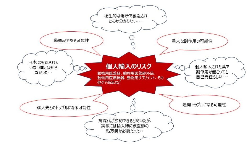 一方で、海外で販売されている動物用医薬品は、上記のような日本国内における品質、有効性及び安全性の確認がされていない未承認動物用医薬品であるため、個人輸入には以下のリスクが伴います。