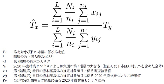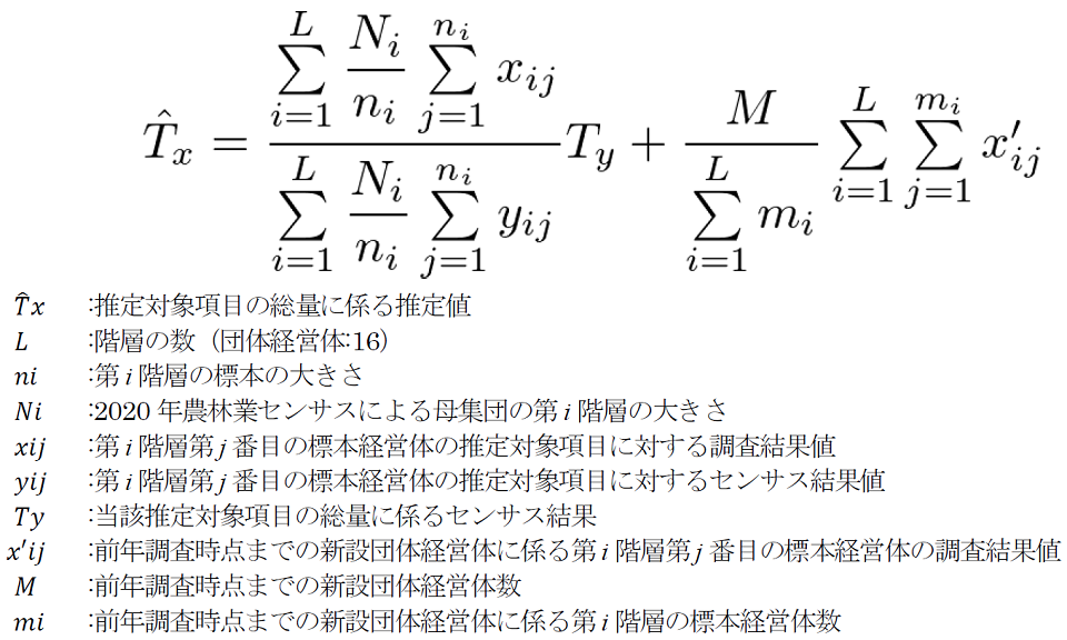 集計区分ごと及び推定対象項目ごとに、農産物販売金額等による最上位階層以外の全階層及び前年調査時点までの新設団体経営体に係る総量を次の推定式により算出し、最上位階層に係る調査値の合計を加え、さらに以下の式で計算される新設団体経営体に係る調整率を乗じて求めている。