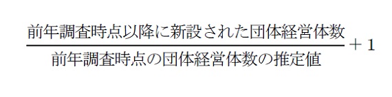 式中の前年調査時点以降に新設された団体経営体数については、市区町村、農業委員会、農業協同組合等からの情報により把握した経営体数としている。なお、新設団体経営体については、その組織属性までは把握できていないため、新設団体経営体以外の団体経営体の推定値により配分している。