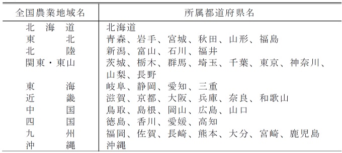 注:上記以外の地方農政局(東北、北陸、近畿及び九州)の結果については、所属府県が上表(1)全国農業地域と同じであることから、表章はしていない。 - 統計数値については、表示単位未満を四捨五入しているため、合計値と内訳の計が一致しない場合がある。