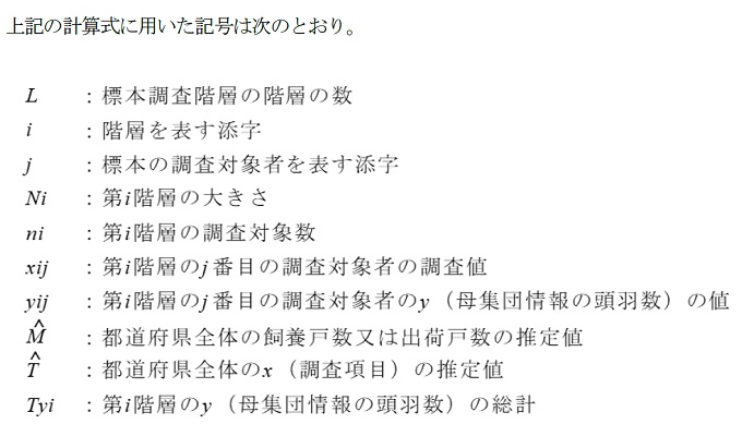 ア 標本調査を行った一般階層にあっては以下の(2)の推定式を用いて、戸数については階層ごとに単純推定、頭羽数については母集団情報の頭羽数の値(母集団リストの整備の過程で把握した飼養者ごとの飼養頭羽数(出荷羽数))を補助変量とする分離比推定により推定した値に、全数調査を行った階層の調査値の合計を加えて算出する。