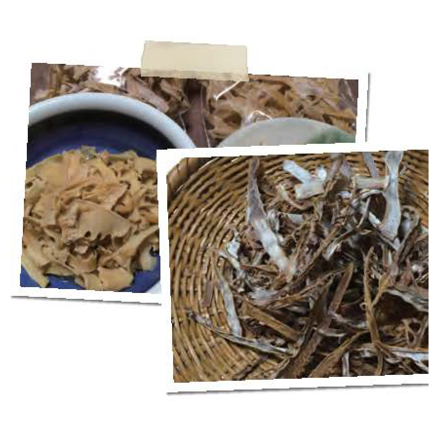 また、干しタケノコは九州でよく食される保存食です。春に収穫したタケノコを茄でた後、干して乾燥させることで、1年を通して食べることができるようになります。お盆の料理の必需品となっている地域もあります。水で戻してから、炒める、煮る、燒く、揚げるなど、さまざまな料理に利用できる食材です。2016年の熊本地震の時に干しタケノコが役立ったそうです。使い慣れた乾物が、いざという時においしいおかずになります。(写真は福岡県東峰村の干しタケノコ、戻して「きんぴら」に)
