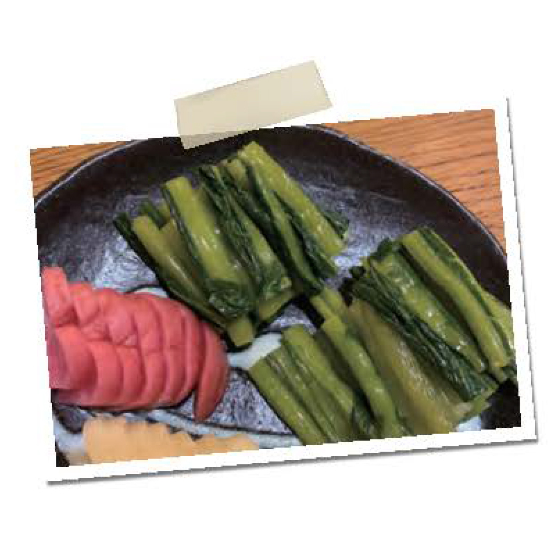 長野県では1年中、季節に相応しい漬物を作ります。冬には野沢菜を漬け、夏には粕に瓜を潰け、保存食にします。ごぼうのみそ漬けも作ります。野沢菜やたくあん潰けは、塩抜きをして細かく刻んで炒め、砂糖、しょうゆ、みりん、酒で味付けます。みそ漬けとナス、キュウリ、ミョウガ等の夏野葉を細かくきざんで、ご飯の上にのせて食べる「やたら」という郷土料理があります。冬の野菜不足を補うための先人の知恵が、災害時には食ベ慣れた味の非常食として活躍します。(写真は長野県北部の漬物盛り合わせ)