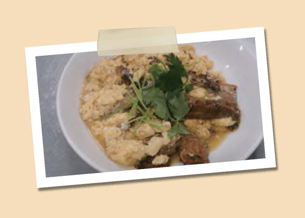- 2:卵を割り入れ、ざっくり混ぜて30秒ほど待ったら火を消す。あとは余熱で火を通す。最後に長さ4cm程度に切った三つ葉を散らす。