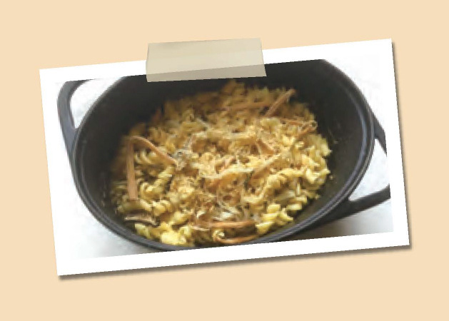 - A 【ショートパスタ(フリッジ、ベンネ、マカロニなど)200g(2カップ強) /切干大根8g(ぎゅっと握って卓球ボール程度) /スライス干し椎茸8g(20スライス程度)/さきいか16g(女性の掌に乗る程度) /塩毘布4g(ひとつまみ) /鰹削り節1g(ひとつまみ) /ひたひたの水】/塩・胡椒 各少々